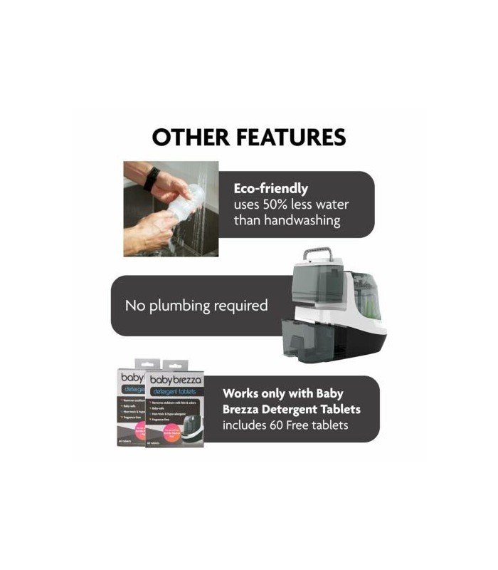 FREE60 Baby Brezza Detergent Tablets included. Removes stubborn milk residue and odor. Baby-safe, non-toxic, hypo-allergenic and fragrance-free