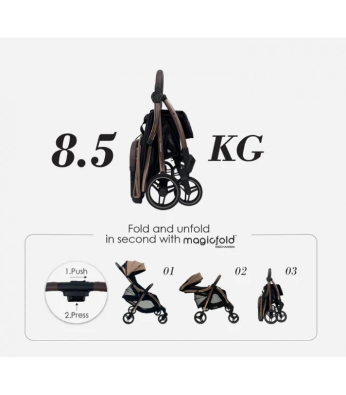 For parents, the MagicFold mechanism provides an easy one-hand folding solution. The stroller folds into a compact, self-standing position for convenient storage at home, in the car, or on public transport.
