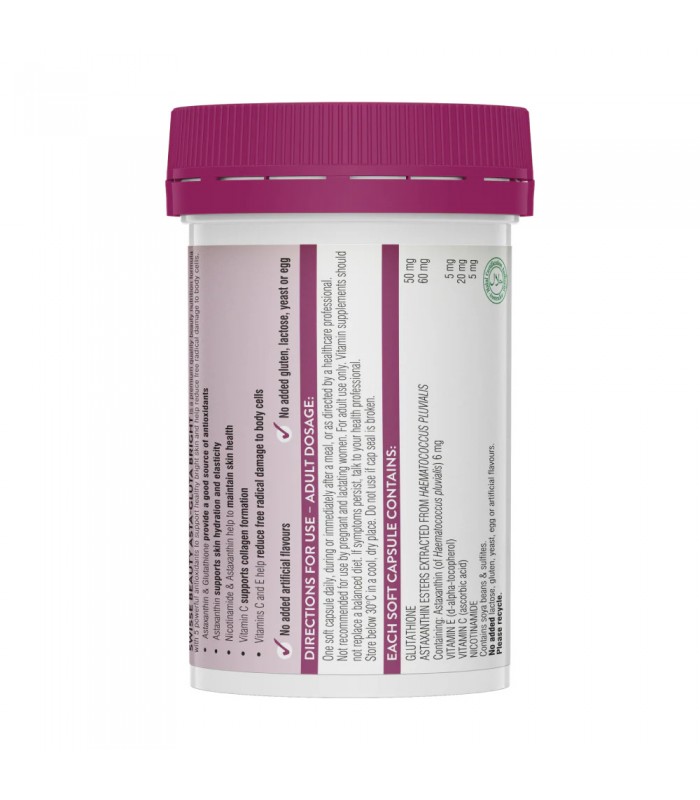Swisse Beauty Asta-Gluta Bright is a premium quality beauty nutrition formula packed with 5 powerful antioxidants to support healthy bright skin and help reduce free radical damage to body cells.