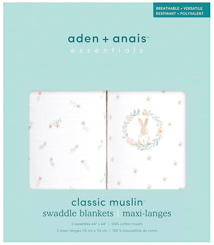 • Includes 44in x 44in (112 x 112 cm) muslin swaddles