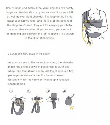 Experience has taught that users tend to wear the Mini Sling too low and too loose. The neck and back of the baby will not get the proper support. Therefore our advice is: wear the sling high, with your baby’s head against your sternum and its body snugly against yours! You are carrying the Mini Sling at the correct height if you can easily kiss your baby on its little head.