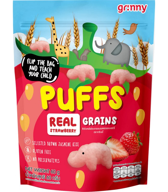 GRINNY Baby puffs are made from organic brown jasmine rice and 100% natural ingredients with no added salt, sugar, artificial colors/favors, and preservatives. Coming in a cute elephant shape, our soft multigrain puff is made specifically for teething, perfectly for introducing solid food to a child.