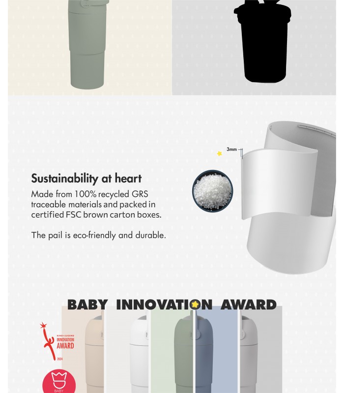 Meet your new nursery hero ¬– Award winning patented odour-stop system that traps smells before they escape, keeping your room smelling nice and fresh. With a larger capacity, it’s perfect for a few mess-free days, and it works with any regular plastic bag – no special refills needed!