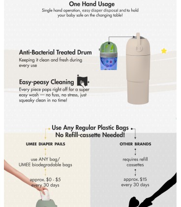 - No special refill cassette needed (use any plastic bags/Umee biodegradable bags)
